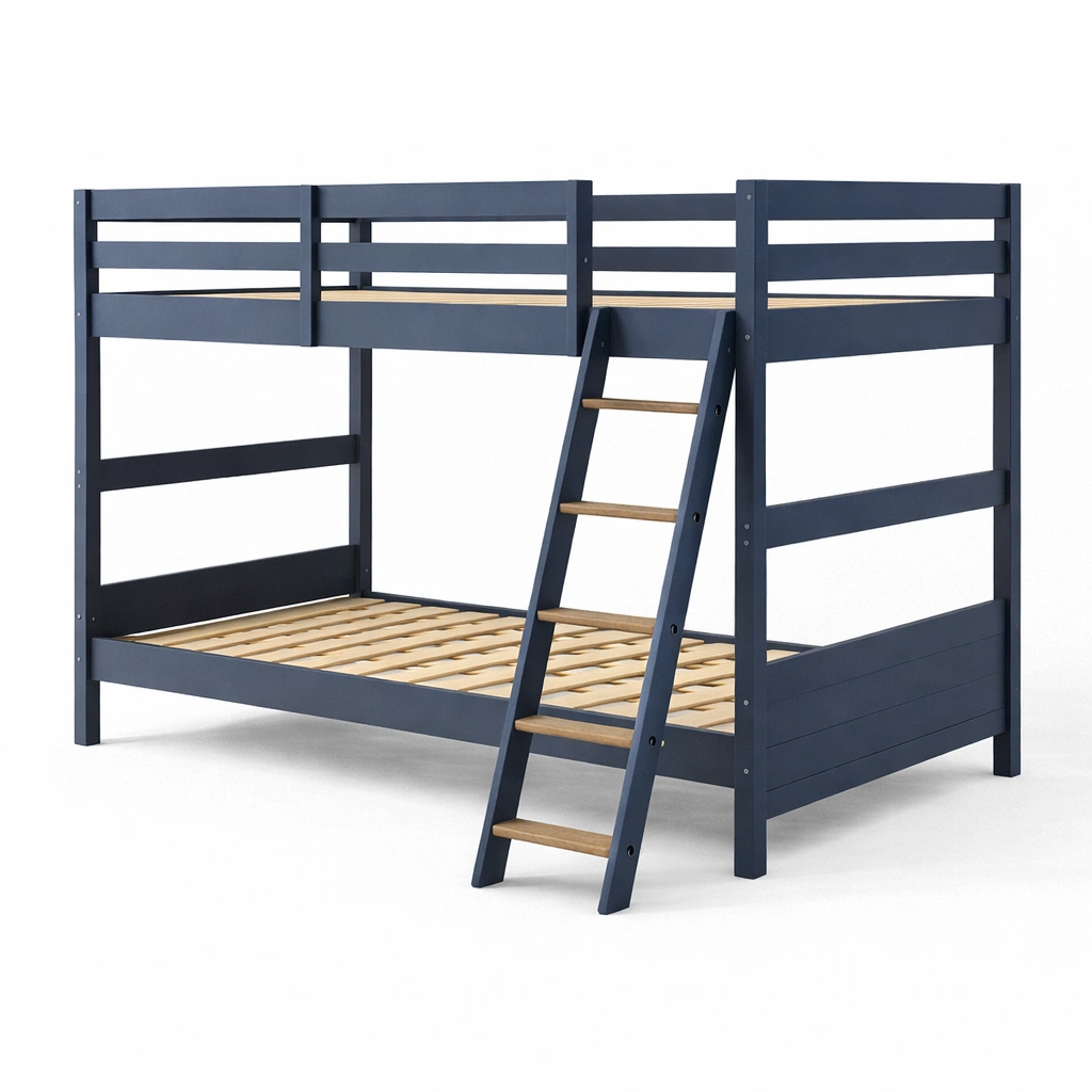 Etagenbett aus massivem Kiefernholz mit den Maßen 208x97x150 cm. Das Bett ist in Blau gehalten. Geeignet ab 6 Jahren. Maximale Belastung pro Bett: 100 kg. Leiter aus Kiefernholz.