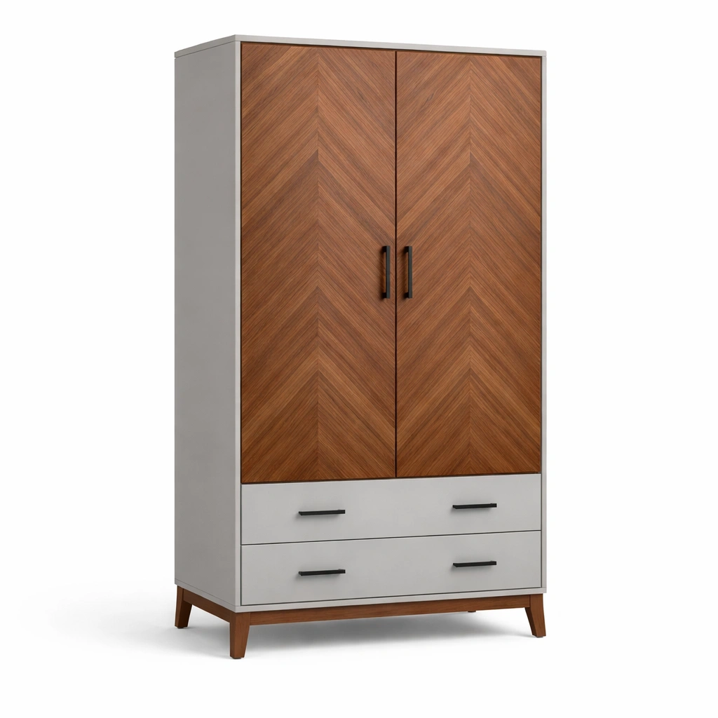 Der Kleiderschrank besteht außen aus Holzfurnier und innen aus MDF. Er verfügt über 2 Türen und 2 Schubladen. Die Maße betragen: Höhe 180 cm, Breite 90 cm, Tiefe 50 cm. Die Farbe ist Braun und Grau.